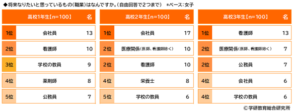 学年別で見ると、男子は2年生の1位が「学校の教員」で、1年生と3年生の3位は「運転士・運転手」が3位、2年生の3位は「エンジニア・プログラマー」という結果に。女子では、1年生と2年生の1位が「会社員」、3年生の1位は「看護師」、2年生と3年生の2位は「医療関係」だった。