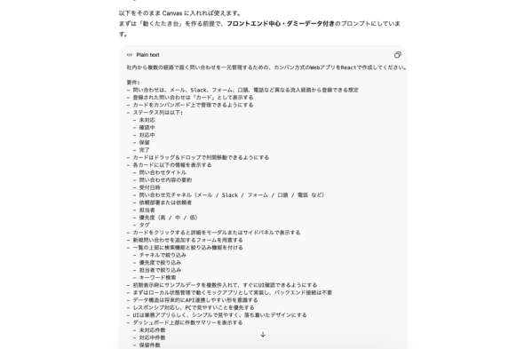 社内から経路の異なる問い合わせが集まってくるのを集約して、管理するためのアプリを作りたい。入力した情報がカードとして表示され、カンバン方式でステータス管理できるようにしたい。CanvasでWebアプリを制作するためのプロンプトを作って。
