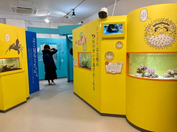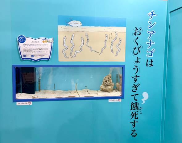 「アワビの顔はこわすぎる」「チンアナゴはおくびょうすぎて餓死する」など、一般的な水族館では見られないないような紹介文が並ぶ。また、「ヒラリーカエルガメ」や「グラスフロッグ」など聞き慣れない生き物も展示されていて、子どもの知的好奇心を刺激する要素もある。