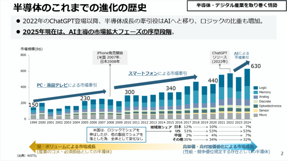 世界の半導体市場はこれまで、PCや液晶テレビ、スマートフォンの普及が成長を牽引(けんいん)してきた。しかし、2022年のChatGPT登場を機に、その主役は「AI」へと移る。かつての汎用的な演算処理から、AIの学習・推論を支える高度な計算資源へと、市場のニーズが塗り替えられたのだ。