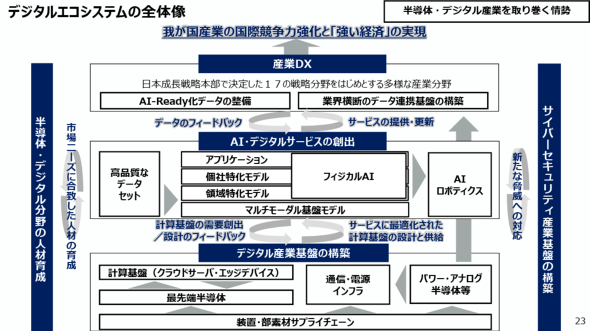 経済産業省の「半導体・デジタル産業戦略の今後の方向性」によれば、2025年現在は「AI主導による市場拡大フェーズの序章段階」だという。これまではクラウド上での活用が中心だったものの、今後はあらゆるデバイスにAIが搭載される「エッジAI」やフィジカルAIの普及により、市場はさらなる成長期を迎える。