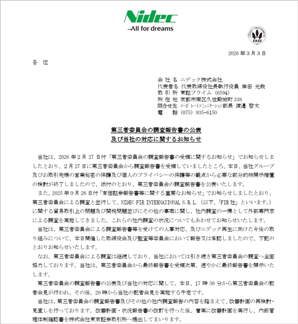 なぜ、こんなものが世の中にさらされたのかというと、2025年9月、巨額の不正会計の疑いが強まったことを受け、ニデックに第三者委員会が設置され、その調査報告書が公表されたからだ。