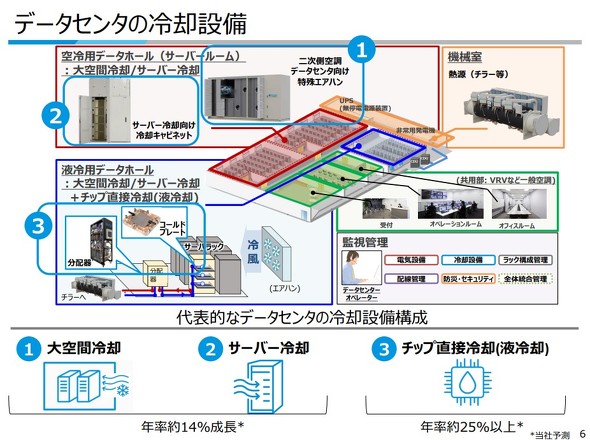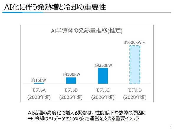生成AIブームが起きる前は、空間を一定の温度に保つことができれば問題はなかった。しかし、複雑な処理が増え、チップが高性能化した現在は、データセンターにおける発熱量が増加。チップの高温化は、故障や性能低下を招くリスクがあり、データセンターを問題なく動かし続けるために、冷却の在り方を見直す動きが広がっている。