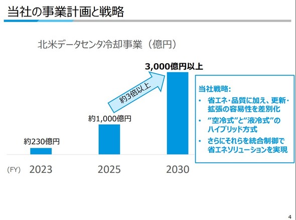 こうした中、生成AIを動かす“インフラ”として存在感を強めているのが、空調大手のダイキン工業だ。家庭用エアコンや業務用空調機のイメージが強い同社だが、北米を拠点にデータセンター冷却事業を強化してきた。2023年の売上高は約230億円。2025年には約1000億円に上る見込みで、2030年には約3倍の3000億円以上を目指す野心的な目標を掲げている。