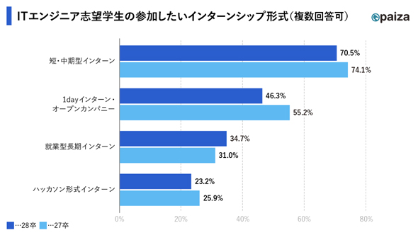 希望するインターン形式について、27卒と28卒の回答結果を比較すると、大きな変化は見られず、「実践重視の短・中期」が約7割、「タイパ重視の1day」が約5割と、これら2つのインターン形式は、引き続き人気の傾向にあった。