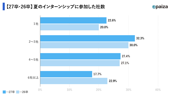 27卒の学生は、どのくらいインターンシップに参加したのか。夏インターンへの参加社数を26卒と比較すると、「6社以上」と回答した割合は減少していた。一方で「2〜3社」といったボリュームゾーンは維持している。