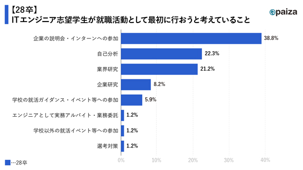 28卒学生に「就活で最初に行おうと思っていること」を聞くと、「企業の説明会・インターンへの参加」(38.8%)が、自己分析や適性検査対策を抑えて最多だった。