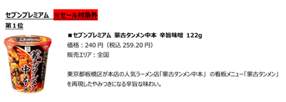 牛乳は地域や年代に関係なく、年中消費する商品であるため、牛乳が売り上げ1位となるのが普通です。実際、牛乳はどこのスーパーやコンビニでも販売数量、金額共にトップクラスに売れる商品。しかし、セブンプレミアムの1位は蒙古タンメン中本のカップ麺なのです。