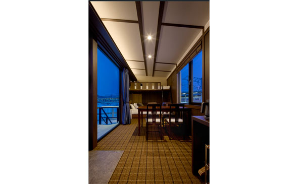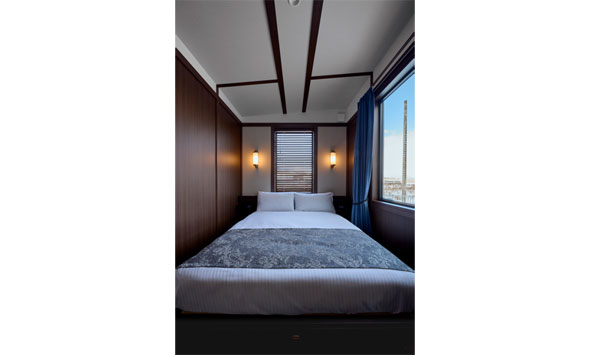 客室のテーマは「函館クラシックモダン」。どこか寝台列車のような雰囲気があって、窓の外に実際の列車が見えるので、ちょっとした“旅情”を感じる空間になっている。