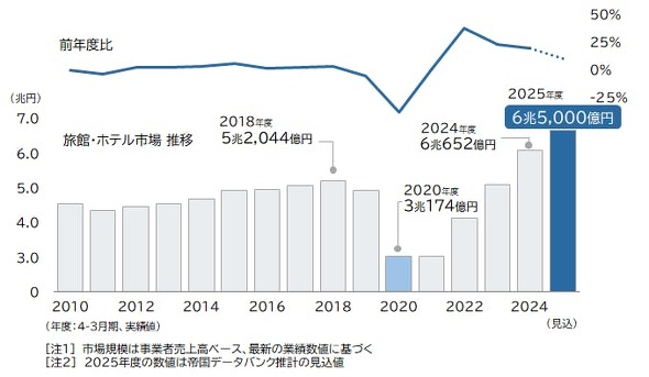 帝国データバンクの調査によると、2025年度の旅館・ホテル市場(事業者売上高ベース)は6.5兆円に到達する見通しだと分かった。過去最高だった前年度の6兆652億円を上回り、4年連続で市場拡大が続く見込みだ。