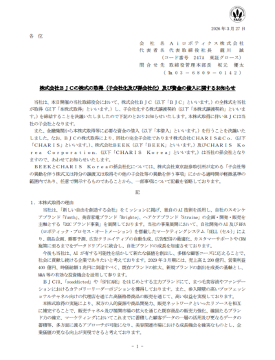 Aiロボティクスは3月30日に続伸。前週末27日の取引終了後に、福岡市の化粧品会社BJCを約257億円で完全子会社化すると発表したことが好材料視された格好だ。
