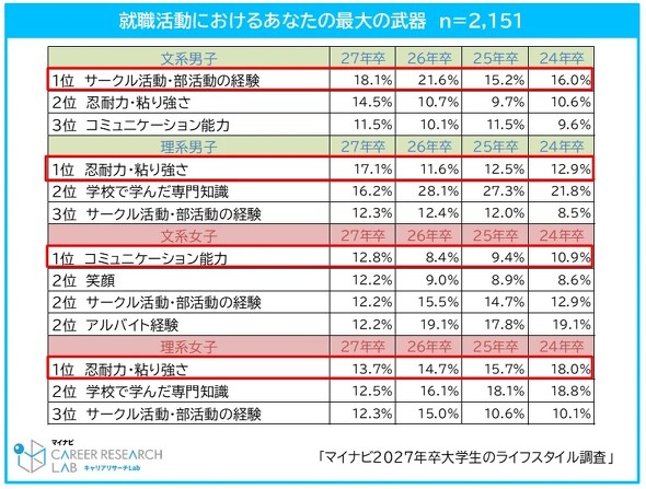 就活における自身の最大の武器について、文系男子の1位は「サークル活動・部活動の経験」(18.1%)、文系女子の1位は「コミュニケーション能力」(12.8%)だった。文系女子は、2位に「笑顔」「サークル活動・部活動の経験」「アルバイト経験」(いずれも12.2%)が並んだ。