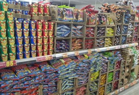 サンディの店舗に行くと、高く積まれた段ボールの箱が並んでおり、殺風景な倉庫のような印象を受ける。特に、菓子パン、おにぎり、カップ麺、ポテトチップスなどは100円を切る商品が多数あり、安さを実感する。
