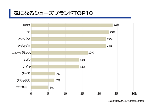 また、ランニングシューズとしての人気も高まっている。「ランナー世論調査2025」によると、HOKAは「現在履いているシューズメーカーTOP10」でアシックス、ナイキ、アディダス、ニューバランスに次ぐ5位(14%)。「気になるシューズブランドTOP10」は僅差だが、人気のOn(23%)を抜いて、1位(24%)を獲得した。