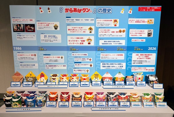 からあげクンは1986年の発売以来、今年で40周年を迎えるロングセラー商品だ。「指でつまんで歩きながら食べられるホットスナック」として誕生し、累計販売数は約48億8000万食に達している。これらを直線上に並べると約98万キロメートルとなり、地球と月の間を直線距離で約1.3往復できる距離に相当するという。