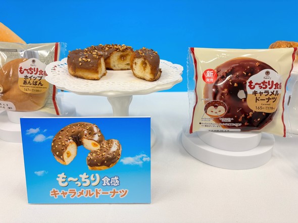 ラインアップは3種類。ドーナツ生地にキャラメルクリームを絞った「も〜っちり食感キャラメルドーナツ」(178円)、もちもちとしたパン生地でこしあんとミルクホイップを包んだ「も〜っちり食感ホイップあんぱん」(158円)、ピザソースとチーズソースを生地で包んだ「も〜っちり食感ピザパン」(198円)を用意した。