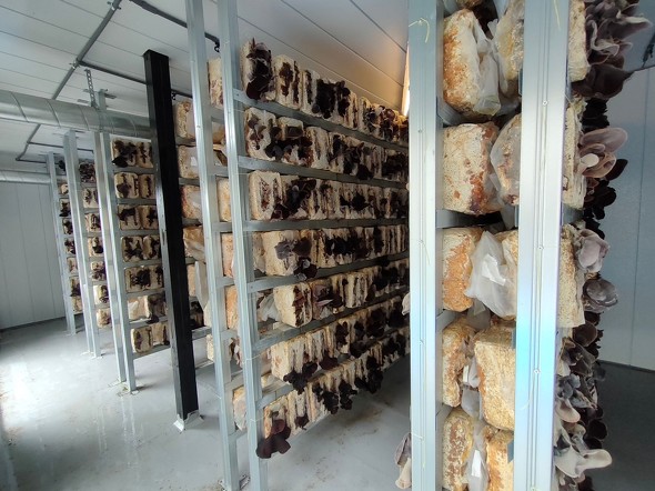 ビニールハウスでは冬季の温度管理が難しく通年栽培ができないと知り、ハウスからプレハブに移行。1000床規模に拡張した。きくらげ栽培の適温は25度前後で、一定の温度を下回ると、成長が止まる。成長過程では二酸化炭素も発生するため、濃度を測りながら換気を行う必要がある。スプリンクラー形式の自動散水装置も自作し、外気を加熱して室内に導入する暖房設備を設置。人手に頼らず管理でき、安定供給できる体制を整えた。