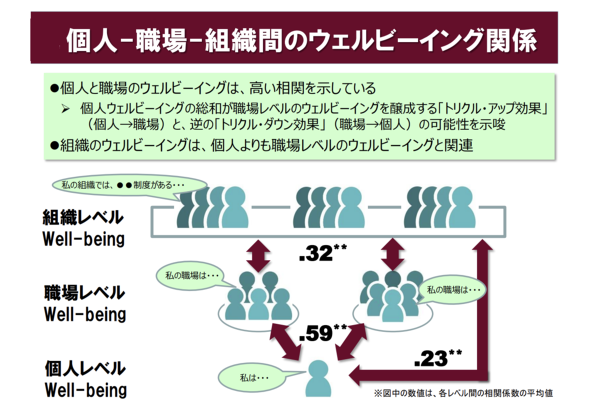 そして企業の従業員を対象にした調査で、個人のウェルビーイングと所属する職場のウェルビーイングに高い相関があることを見出した。ウェルビーイングな個人が同僚にも良い影響を与え、職場全体の状態を高めていく。逆に職場全体の信頼関係や良好な雰囲気が、個人のウェルビーイングを底上げする。この相互作用が確認されたのである。