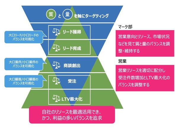BBMのメリットは、マーケティングや営業施策の各段階で量と質のバランスを取りながらリードと向き合い、売り上げ・利益の最大化を狙える点にある。