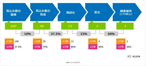 ICPを定義したら、各プロセスで保有しているリード件数とICP率を確認する。例えばWebで400件の見込み客のリードを獲得し、ICP該当リードが150件あればICP率は37.5%――といったように計算できる。