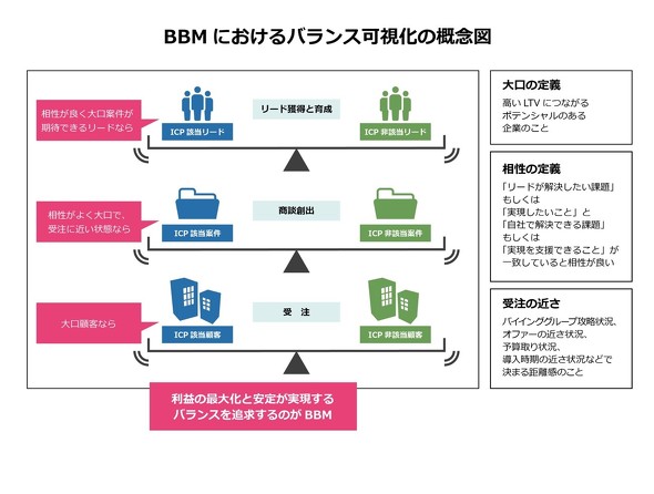 このようにICP率や営業の意向、市場動向などをみながら、量を狙うか質を狙うかの施策の方針を決めて柔軟に対応していく。こうして営業・マーケティング施策をタイムリーにバランスよく展開していくのがBBMの大まかなフローだ。