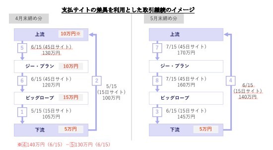 巧妙だったのは支払サイト、つまり決済までのタイムラグを利用した点だ。ビッグローブや一部の下流代理店が短い支払サイト(今回の場合は15日)で「先出し」することで、循環させる金銭の原資を確保していたという。この仕組みにより、外部からの新規資金を持ち込まなくても、一定期間は取引を回し続けることができた。