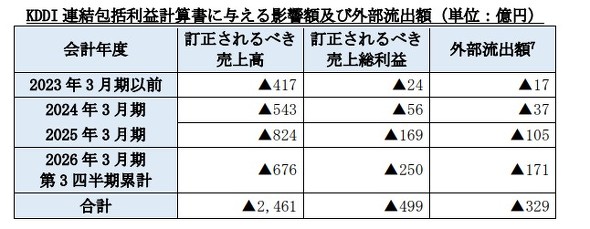 それから約7年。2026年3月31日にKDDIが公表した特別調査委員会の報告書は、衝撃的な事実を明らかにした。子会社ビッグローブおよびジー・プランの広告代理事業における売り上げのうち、実に99.7%が架空だったのだ。累計の売り上げ取消額は2461億円、グループ外部への資金流出額は329億円に上る。