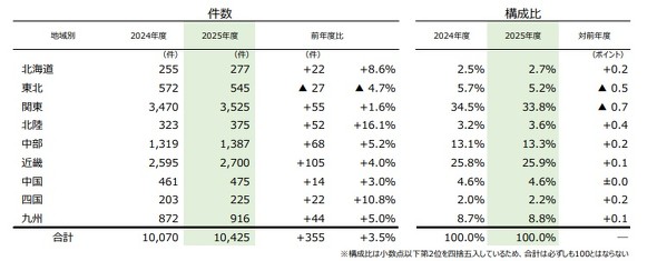 地域別では「東北」(前年度比4.7%減)を除く8地域で過去10年で最多となった。「関東」(同1.6%増)は全体の33.8%を占め、4年連続で前年度を上回った。増減率は「北陸」(同16.1%増)が最も高かった。