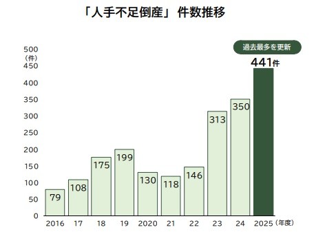 人手不足による倒産は441件で、初めて400件を超え過去最多となった。業種別では「サービス業」(114件)が最多で「建設業」(112件)、「運輸・通信業」(69件)が続いた。