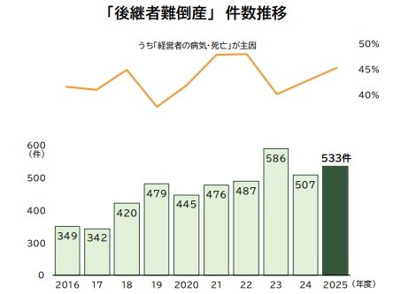 後継者不在で事業継続が困難となった「後継者難倒産」は533件で、2年ぶりに前年度(507件)を上回った。