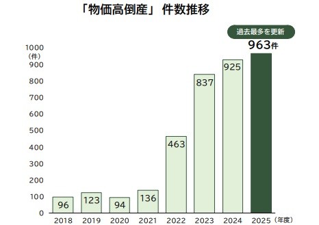 帝国データバンクは「小規模倒産が大半を占めており、長引く物価高に加え、人件費高騰、金利負担の増加などコスト上昇分を販売価格に転嫁できず、資金繰りが悪化した中小零細企業の厳しい現状が浮き彫りとなった」と指摘した。