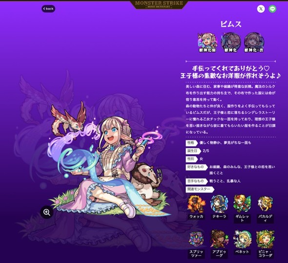 モンストには、キャラクターの設定情報をまとめた「モンストディクショナリー」というものがある(なお、Webサイト上で公開されているのは一部のキャラクターに限る)。各キャラクターの紹介ページには、名前やイラストだけでなく、キャラクターの性格や誕生日、性別、好きなものや苦手なものなどが掲載されている。