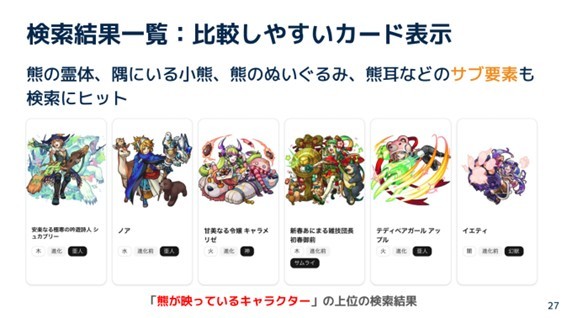 例えば「熊が映っているキャラクター」と検索してみると、次のようにキャラクターのカードが並ぶ形で検索結果が出てくる。