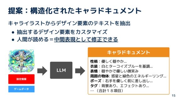 例えば、AIにキャラクターのイラストを渡して、それに含まれる情報を直接ベクトル化(テキストや画像などのデータを、AIが理解・処理できる「数値の配列」(ベクトル)に変換すること)するのではなく、まず「キャラドキュメント」(キャラクターのデザイン要素を箇条書きでまとめたテキスト)をAIで生成。“人間が確認・修正したうえでベクトル化する”というワンクッションを挟むようにしている。