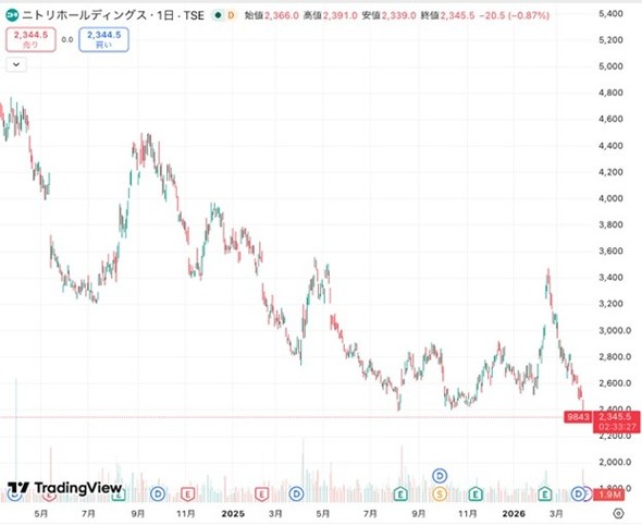 ニトリホールディングス(以下、ニトリHD)の株価は、2024年3月に上場来高値の約2万4000円(分割前)を記録した後、下落の一途をたどっている。