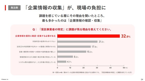 今回の調査でも、不安を感じている様子がうかがえた。発注側の法務担当者のうち59.5%が受託事業者の特定に「課題がある」と回答した。最大の理由は「企業情報を個別に確認・収集する必要がある」(32.9%)だった。