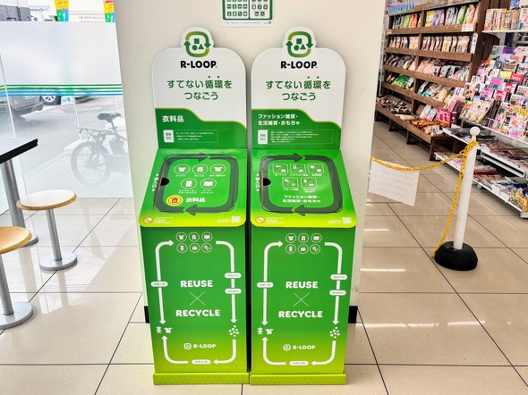 ファミリーマートは4月13日、衣料品や雑貨の回収ボックス「R-LOOP」(アールループ)を店内に設置する実証実験を始めた。リユースショップ「BOOKOFF」を運営するブックオフコーポレーションと共同で展開する。