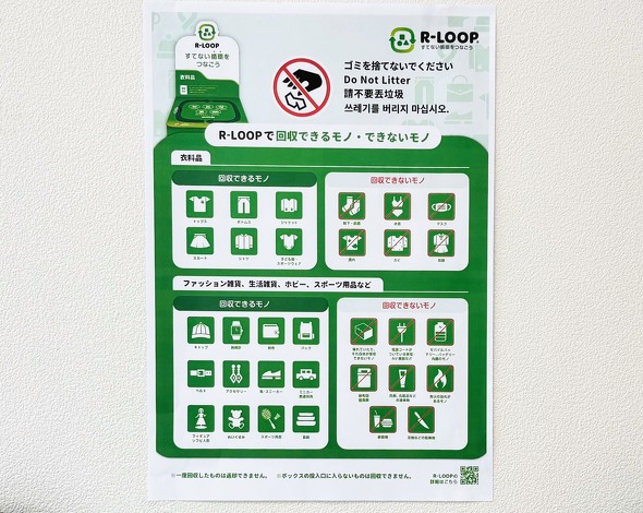R-LOOPは、ブックオフコーポレーションと繊維製品の回収・循環事業を手掛けるBPLab(東京都港区)が共同運営する回収ボックスだ。4月13日時点で、市役所庁舎や大学、スポーツセンターなど全国712カ所に設置している。
