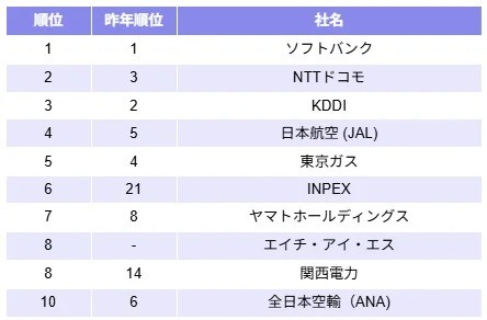 インフラ業界では「ソフトバンク」が1位だった。2位は「NTTドコモ」、3位は「KDDI」、4位は「日本航空(JAL)」、5位は「東京ガス」だった。