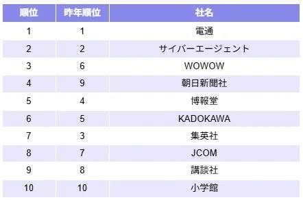 メディア業界では「電通」「サイバーエージェント」「WOWOW」が上位だった。