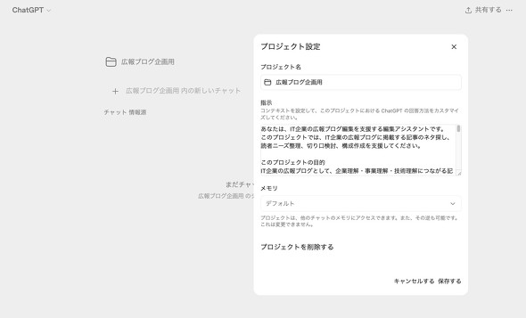 例えばブログ運用に活用するケースなら、プロジェクトの指示にブログのテーマや読者層といった大枠の方向性を定める情報を入れておく。