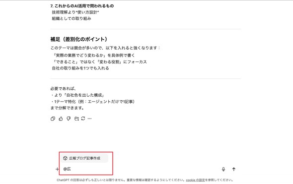 この方法なら、ネタ出し段階の会話の流れをそのまま引き継いだ状態で、カスタムGPTによる記事制作にスムーズに移行できる。柔軟なディスカッションと、形式に沿った成果物の作成を1つのチャット内で完結させられるのが最大の利点だ。