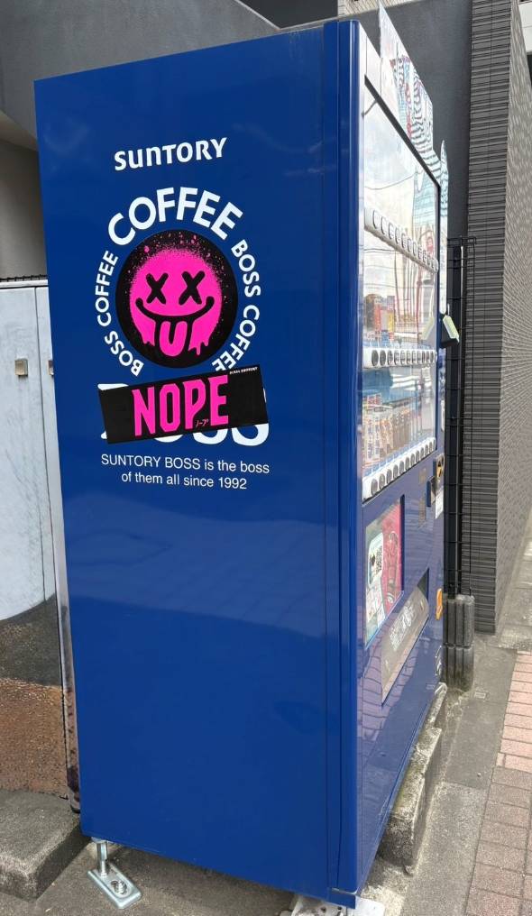 自販機でのマーケティング施策も注目された。コーヒーブランド「BOSS(ボス)」のロゴマークの上から、ノープのフェイスアイコンのステッカーを貼り付けたものだ。