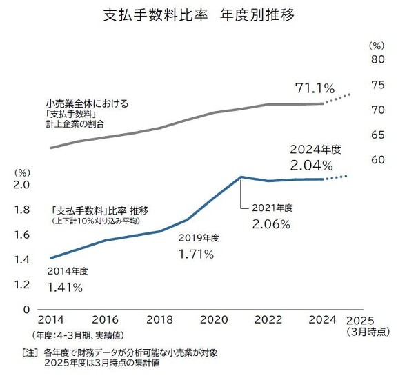 支払い手数料を計上する小売企業の数も増加している。2022年度に初めて1万社を超え、2024年度には分析可能な小売企業全体の約7割に拡大した。