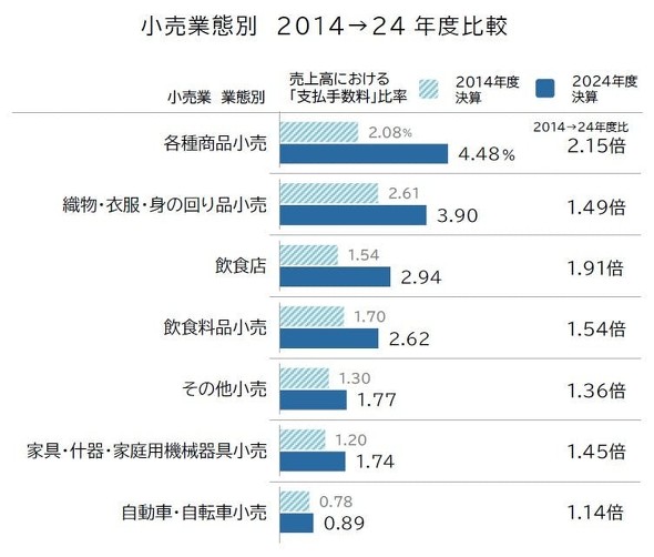 飲食料品や日用品を扱う「飲食料品小売」(2.62%)では、手数料比率が10年前の1.54倍に上昇した。百貨店や総合スーパーを含む「各種商品小売」(4.48%)は、宝飾品や高級アパレル、お中元・お歳暮など高額商品の決済が多く、自社クレジットカードの利用も多いことから、業態別で最も高い水準となった。