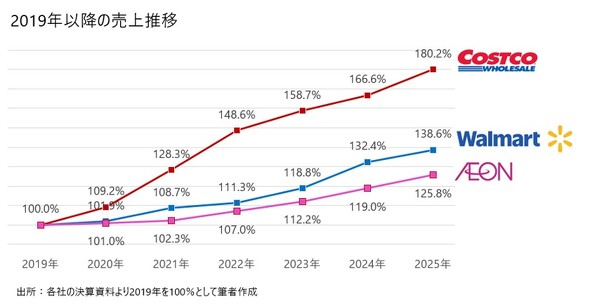 まず、その成長率に注目する必要があります。2019年度を100%とした場合、2025年の売上高は、ウォルマートが約138%、イオンは約125%といずれも堅調な成長を遂げています。対してコストコは2018年9月期→2025年8月期の間に約180%と、競合をさらに上回る成長を実現しています。