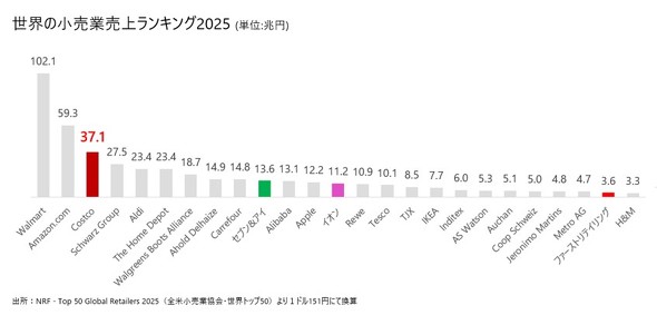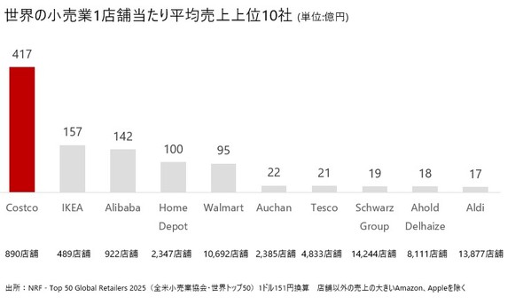 1店舗当たりの平均売上は約417億円とされ、2位のイケアの約2.7倍という圧倒的な水準を誇っています。