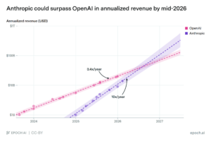 下の図を見てほしい。OpenAIの売り上げは年率3.4倍で成長、Anthropicが10倍で成長している。この傾向が続けば2026年半ばには、AnthropicがOpenAIを追い抜くというグラフだ。
