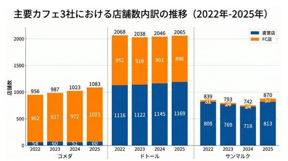 コメダのFC比率は90%を超えているため、本部側は販管費を抑えやすく、高い営業利益率を維持しやすい仕組みになっています。一方、サンマルクは直営店比率が高く、販管費負担が収益を圧迫していると考えられます。