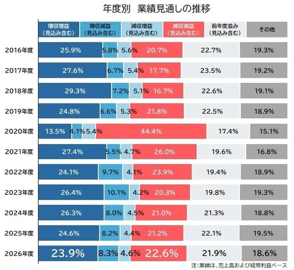 2026年度に「増収増益」を見込む企業は23.9%で、前年から0.7ポイント低下した。3年連続の減少となる。一方「減収減益」は22.6%(同1.4ポイント増)で、3年連続で増加した。「前年度並み」は21.9%(同0.2ポイント減)だった。